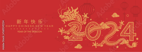 Happy chinese new year 2024 the dragon zodiac sign with flower,lantern,asian elements gold paper cut style on color background. ( Translation : happy new year 2024 year of the dragon ).