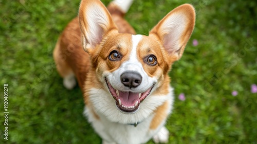 dog, happy, cute, pet, playful, tail, smiling, fur, brown, white, ear, eye, grass, green, outdoors, portrait, adorable, animal, canino, welsh, breed, fluffy, joyful, excited, looking, up, front, view, closeup, friendly, companion, domestic, mammal, paw, face, tongue, open, mouth, beautiful, sunlight, affectionate, love, family, funny, posing, day, cheerful