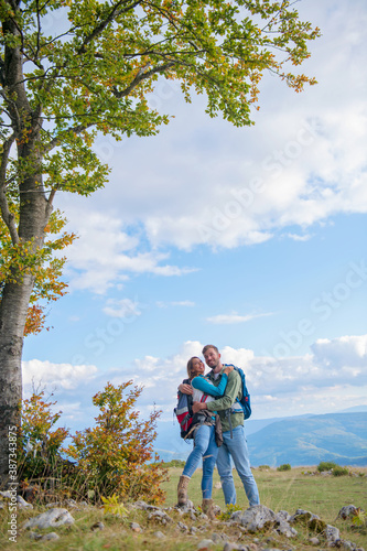 Happy couple hiking and enjoying a valley view and hugging