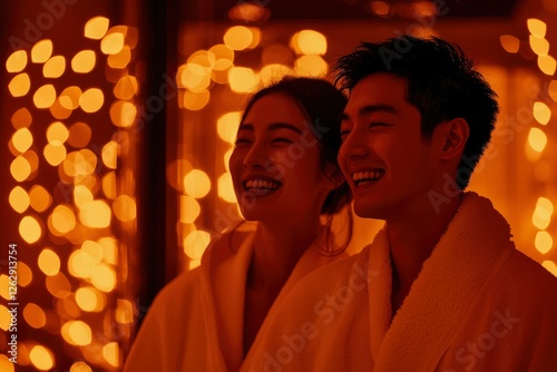couple, happy, spa, relaxation, evening, light, love, romance, togetherness, joyful, smiling, intimate, tender, wellness, light, warm, romantic, night, soft, warmth, delighted, radiant, content, peaceful, calm, affectionate, close, carefree, gentle, portrait, laughing, affection, human relationships, together, interior, joy
