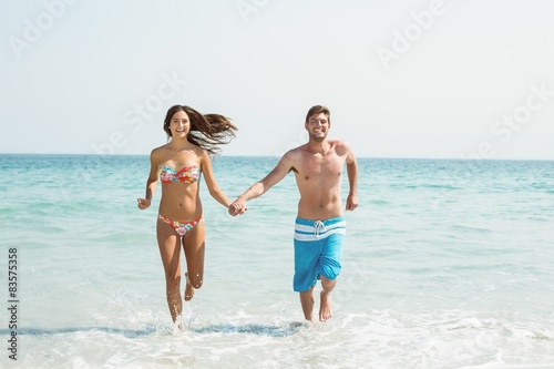 young adult, man, male, caucasian, woman, female, photogenic, beautiful, attractive, coastline, shore, summer, holiday, beach, sunny, bright, vacation, warm, lifestyle, leisure, sunshine, sunlight, holiday, summer, fit, slim, toned, athletic, cute, bikini, standing, love, affection, couple, human relationships, together, happy, smiling, cheerful, holding hands, portrait, running, jogging, fun