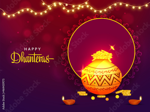 Happy Dhanteras Poster Design With Shiny Gold Coin Pot, Lit Oil Lamps (Diya), Lighting Garland On Red And Purple Bokeh Background.