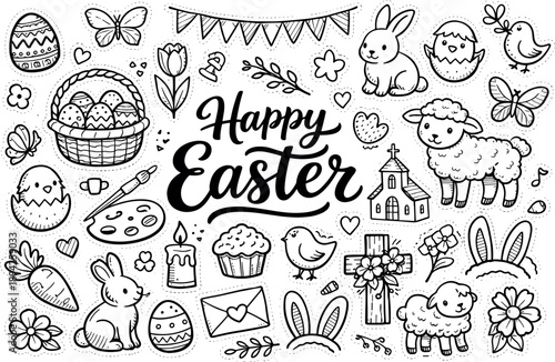Happy Easter festive celebration hand drawn doodle elements set, center hand-lettered title, black & white vector line art, bold