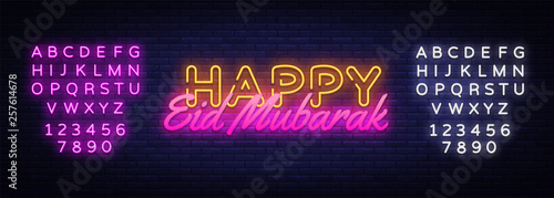 Happy Eid Mubarak festive card design template in modern trend style. Neon style, Islamic and Arabic background. Ramadan Kareem Light banner. Vector. Editing text neon sign