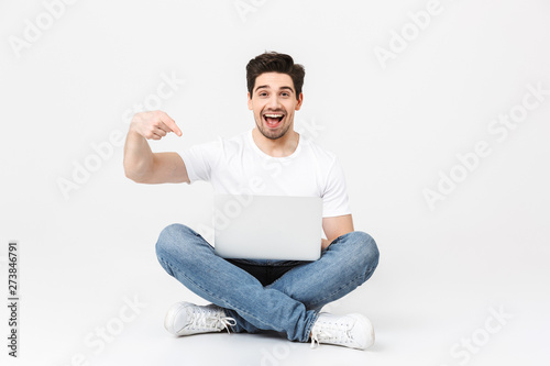 Happy excited young man posing isolated over white wall using laptop computer pointing sitting on floor.