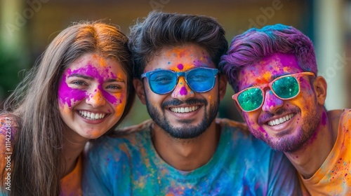 Happy faces of two young men and a woman covered in bright colors at Holi festival