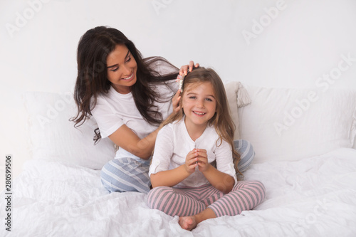 Happy family - smiling mother braids her daughter's hair and coif her in bed early in the morning isolated