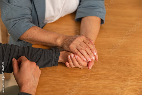 Happy family. Caring woman hands holding hands loving older woman mother. Grown up daughter and mom grandmother enjoying arm bonding. Family generations together at home. Family moment love and care