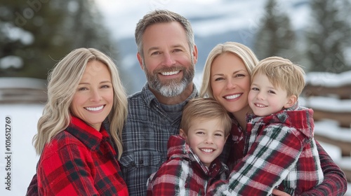 family, snow, winter, outdoors, smiling, cheerful, happy, landscape, plaid, clothing, children, adult, sibling, togetherness, love, bonding, cold, nature, tree, portrait, photograph, happiness, warmth, environment, scenic, seasonal, weather, fun, oneness, blissful, relative, harmony, festive, greeting, joyful, background, wood, cosy, leisure, peaceful, bright, day, serene