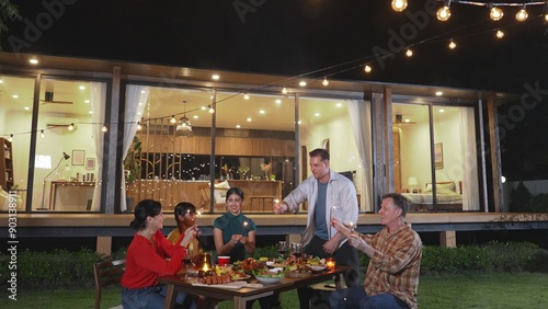 Happy family holding glowed sparkler in holiday celebration party at night. Lovely member enjoy playing spark toy together. Outdoor activity to cross generation gap strengthen family bond. Divergence.
