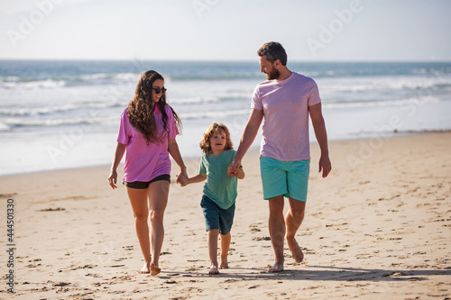Happy family holidays. Father, mother and son child walking on sand beach. Summer vacations with children.