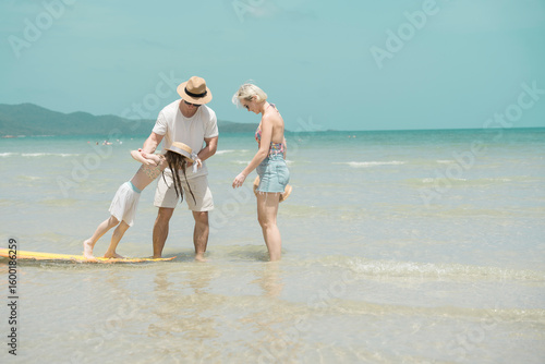 Happy family on the beach. father. with the father, mother, and children playing together by the sea. Joyful Family moment of togetherness, lifestyle of people on a relaxing holiday by the ocean.