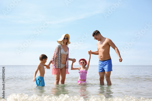 Happy family playing in water at beach on sunny day