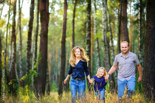 Happy family walks in the evening park, holding hands and having fun