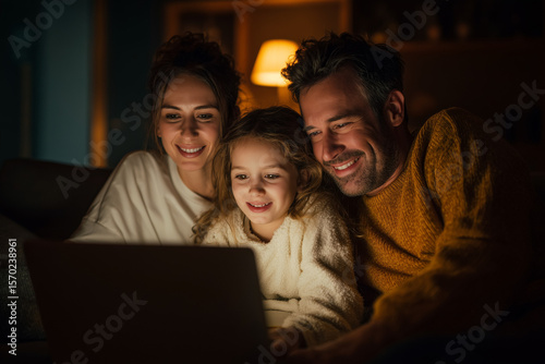 happy, family, bonding, watching, night, laptop, entertainment, happy family, motion picture, home, mother, father, children, cosy, relaxation, domestic, together, eltern, mother, father, daughter, house, couch, evening, film, streaming, online, computer, screen