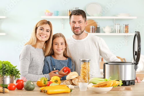 Happy family with modern multi cooker in kitchen