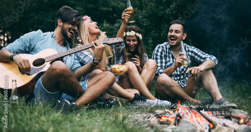 Happy friends playing music and enjoying bonfire