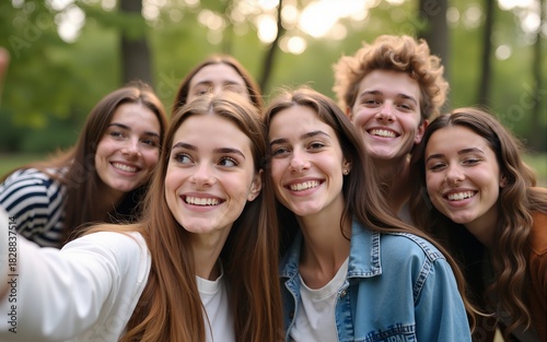 Happy friends taking selfie picture outdoors - Group of young people having fun together at the park - Youth community and people concept. High quality