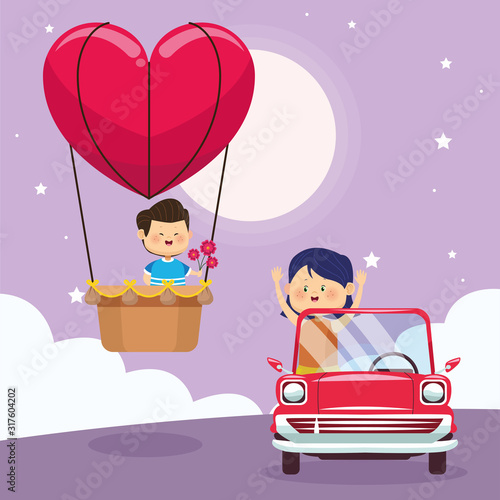happy girl on classic car and boy on heart air balloon, colorful design