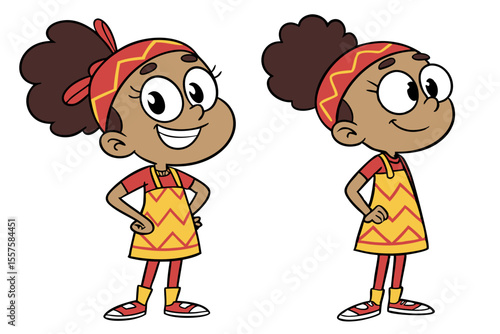 girl, cartoon, curly hair, happy, cheerful, fashion, dress, lass, cute, smiling, children, playful, casual attire, fun, stylish, enjoyment, youthful, childhood, pose, vivid colors, lifestyle, personality, confidence, joyful, casual clothes, vibrant, illustration, trendy, carefree, happiness