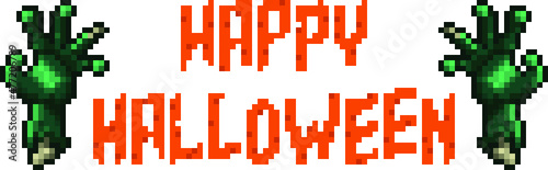 Happy Halloween Pixel Banner with Zombie Hand on White Background.