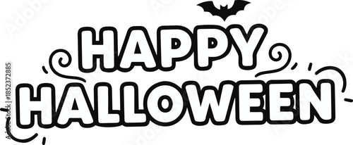 Happy Halloween playful lettering vector illustration. A bold, outlined bubble font design featuring a flying bat silhouette and decorative swirls,