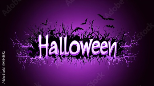 Happy Halloween! Purple background with spooky tree branches and bats.