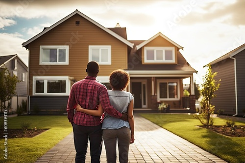 Happy homeowners. Loving couple African American embracing in front of new house. Man and woman standing outside their New Home