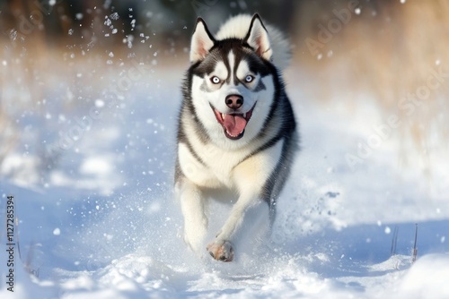 Happy husky runs joyfully through snowy landscape on a bright winter day