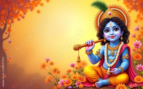 greeting card, flute, worship, symbol, mythical, dharma, happy, god, indian, hindu, avatar, cartoon, celebration, hinduism, young, culture, mythology, poster, character, illustration, krishna, colourful, traditional, festival, holy, religious, card, lord, holiday, tradition, religion, design, vector, india, vishnu, festive