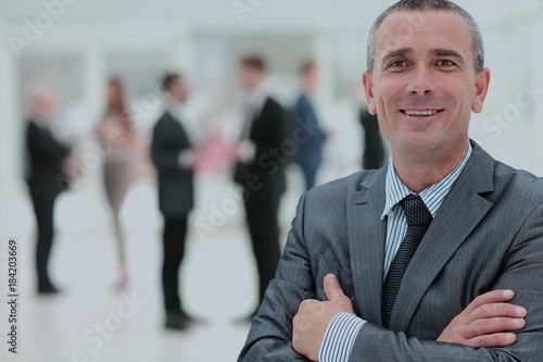 Happy mature business man looking at camera with satisfaction at office