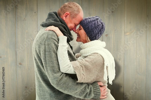 mature adult, woman, female, caucasian, man, male, wood, wooden, grain, digital, computer graphic, plank, floor, flooring, fence, fenced, jumper, foulard, hat, stylish, fashion, wool, woolen, cosy, love, affection, couple, together, posing, feeling, lover, partiality, human relationships, closeness, romance, romantic, hugging, embracing, happy, smiling, cheerful