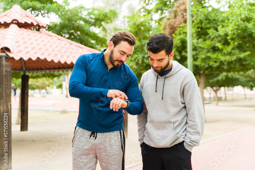 man, exercising, guy, friends, 20s, 30s, caucasian, latin, hispanic, working out, training, man, fitness, tracker, app, physical exercise, run, runner, active, park, sport, jogging, people, lifestyle, finish, cheerful, attractive, photogenic, fit, outdoors, smile, smiling, happy, happiness