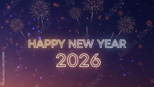 Happy new year 2026 glowing neon text with festive fireworks celebration