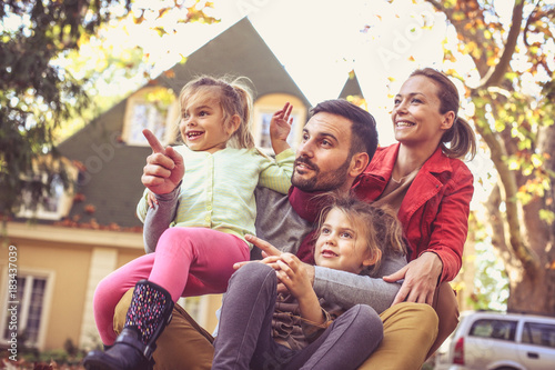 carrying, activity, adult, autumn, bonding, cheerful, fall, father, female, four people, funny, girl, happy, leaf, lifestyle, little girl, man, mother, nature, offspring, outside, parenthood, people, playing, sitting, smile, sunny, togetherness, woman