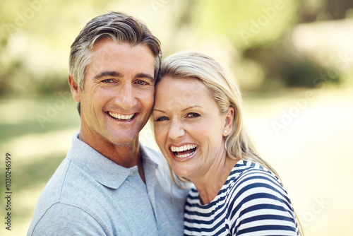 Happy, portrait and mature couple in nature at park for bonding, marriage and connection in morning. Outdoor, hug and man and woman from Australia embracing in garden for romance on date with love.