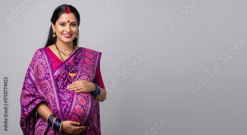 asian, indian, pregnant, woman, motherhood, pregnancy, saree, traditional, happy, smiling, expectant, baby, belly, joyful, culture, ethnic, asia, hindu, new, life, love, affection, hand, portrait, studio, purple, jewellery, bangle, earring, necklace, mother, family, anticipation, hope, future, wellness, healthy, care, elegant, vibrant, attire, beauty, growth, expecting, parenthood, womanhood, happiness