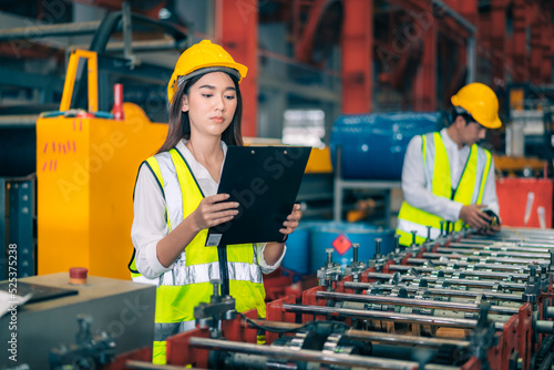 Happy professional beautiful Asian woman industrial engineer/worker/technician with safety hardhat use clipboard to inspect quality control of machinery in production steel manufacture factory plant