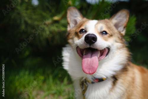 Happy red and white Pembroke Welsh Corgi sitting on grass with tongue out and big smile. The dog wears a bright collar, with pine trees in the background