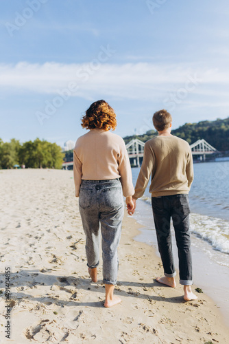 Happy romantic young couple enjoying a beautiful sunset walk on the beach. Vacation lifestyle concept