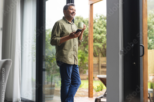 Happy senior biracial man using smartphone at window with cup of coffee at home