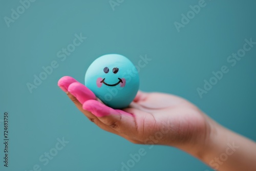 Happy Smiley symbol colorful round circle ball in hand expressing joy and happiness. Smiley and Happy Face Cheerful Emoji Laughing smile radiate positive emotions. Grinning Joyful Expression icon face