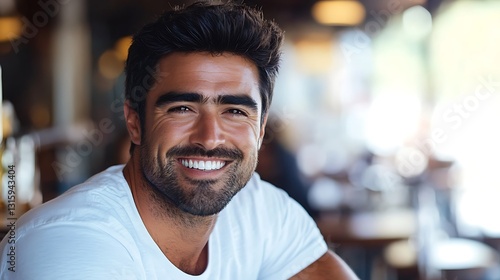 man, happy, smile, smiling, face, portrait, male, person, attractive, photogenic, model, guy, young, adult, caucasian, hair, beard, moustache, teeth, white, shirt, t-shirt, casual attire, cafes, eatery, indoor, background, lifestyle, people, human, expression, emotion, confident, cheerful, friendly, relaxed, content, joy, pleasure, positive, healthy, stylish, fashion, outdoors, lighting, brunette, eyebrow