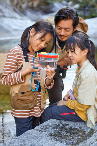 fish, stream, teacher, student, mountain, hiking, people, three people, man, male, adult, children, girl, plastic, fishbowl, holding, china, asia, beijing, east asia, photo, color image, half face, mountain chain, travel, exploration, nature, scenic, tour tourism, holiday maker, travel destination, vacation, adventure, backpacker, suburb, mountaineering, vale