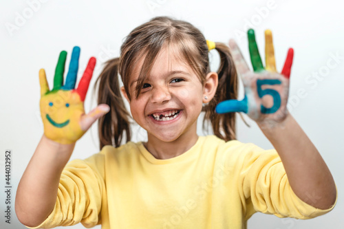 Happy toothless little girl with the five number painted on the hand laughing and having fun - Little girl painting her hands with smiley faces and numbers - The number five and childhood concept