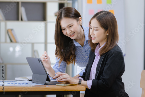 Happy two asian businesswoman working with tablet in meeting room, Businesswoman standing and talking about ideas in office workplace.