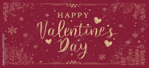 Happy Valentine's Day gold glitter greeting with floral ornament. Gold happy Valentine's Day text on a red background with decorative floral elements
