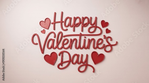 Happy Valentine's Day red script lettering with hearts on light pink background, 3D render for greeting cards and banners