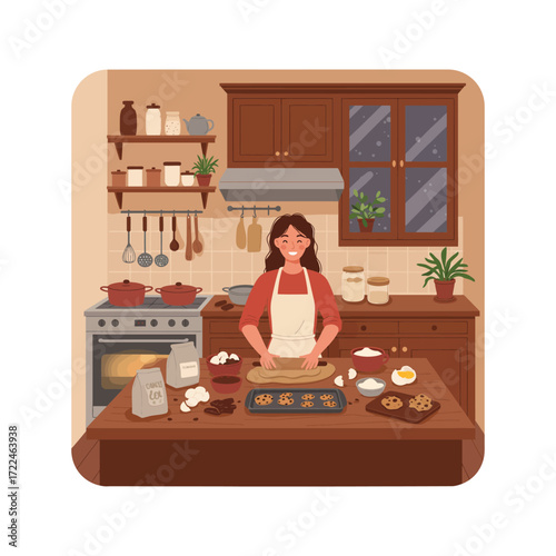 Happy woman baking chocolate chip cookies in cozy kitchen winter scene