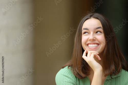thinks, thinking, smile, happy, woman, dream, dreaming, mind, face, girl, street, hope, look, looking, side, laugh, laughing, bliss, hilarious, illusion, imagine, daydream, wondering, deciding, well, being, people, funny, person, confident, teenage, sideway, healthy, dental, care, teeth, white, whitening, teenage, pensive, satisfied, young, outside, dreamer, beauty, remember, house, lady, future